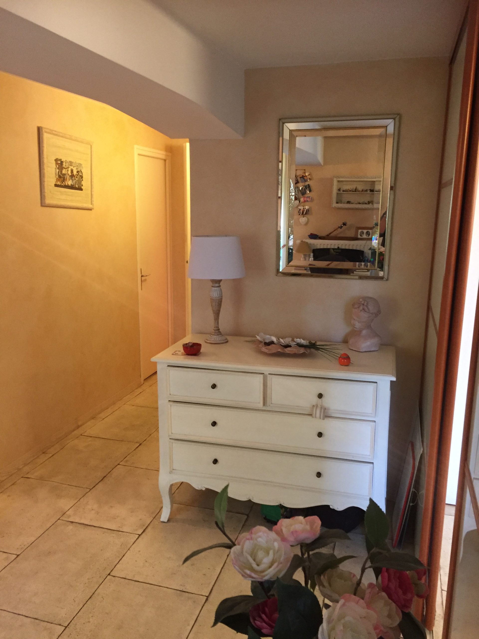 Dans cet espace qui accueille la chambre à coucher et la salle d’eau privative, les clients souhaitaient un ensemble lumineux, chaleureux et apaisant. La supression du muret de l’ancienne douche ,la faience brillante marbrée ainsi que les teintes douces de gris- bleu participent à créer et à agrandir cet espace de détente . Le sol vinyle avec sous- couche acoustique façon bois et la fresque « bord de mer » en tête de lit contribuent également à cette ambiance de relaxation.