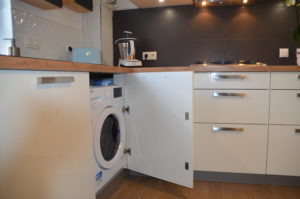 Le choix pour cette nouvelle cuisine s’est porté sur des façades blanches et brillantes pour refléter la lumière avec des poignées audacieuses qui donnent du caractère . Le grand plan de travail façon bois apporte chaleur et pratique pour des instants cuisine partagés. La table accueille des rangements bas et permet de recevoir autour toute la famille et les amis. Le lave- linge et la hotte sont discrètement cachés derrière les façades. Les faiences décoratives et contrastées apportent du relief aux murs blancs pur un ensemble chaleureux.