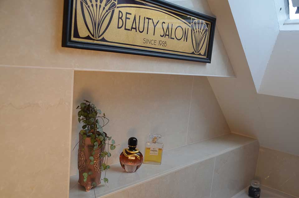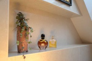 L’armoire de toilette se fait discrète en étant encastrée dans le mur et des niches ont été crées dans la douche et au dessus de la baignoire pour accueillir les produits de beauté.