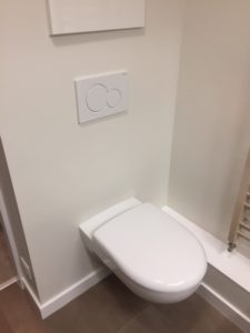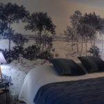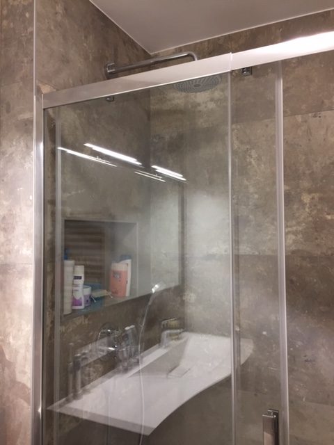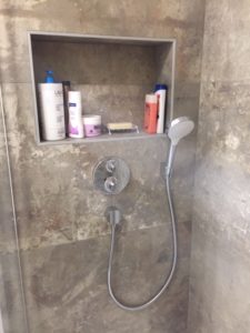 Inspirée de la nature par ce revêtement mural qui semble nous plonger dans la roche et la pierre , cette salle de bain sobre et contemporaine s’habille d’un élégant meuble en forme de vague qui dégage l’espace et apporte confort et douceur.Les courbes de son plan de toilette s’harmonisent avec la cuvette suspendue qui lui fait face ,créée dans cette pièce et n’existait pas auparavant. La douche , toute en sobriété avec sa robinetterie encastrée et sa paroi transparente complète le tableau.